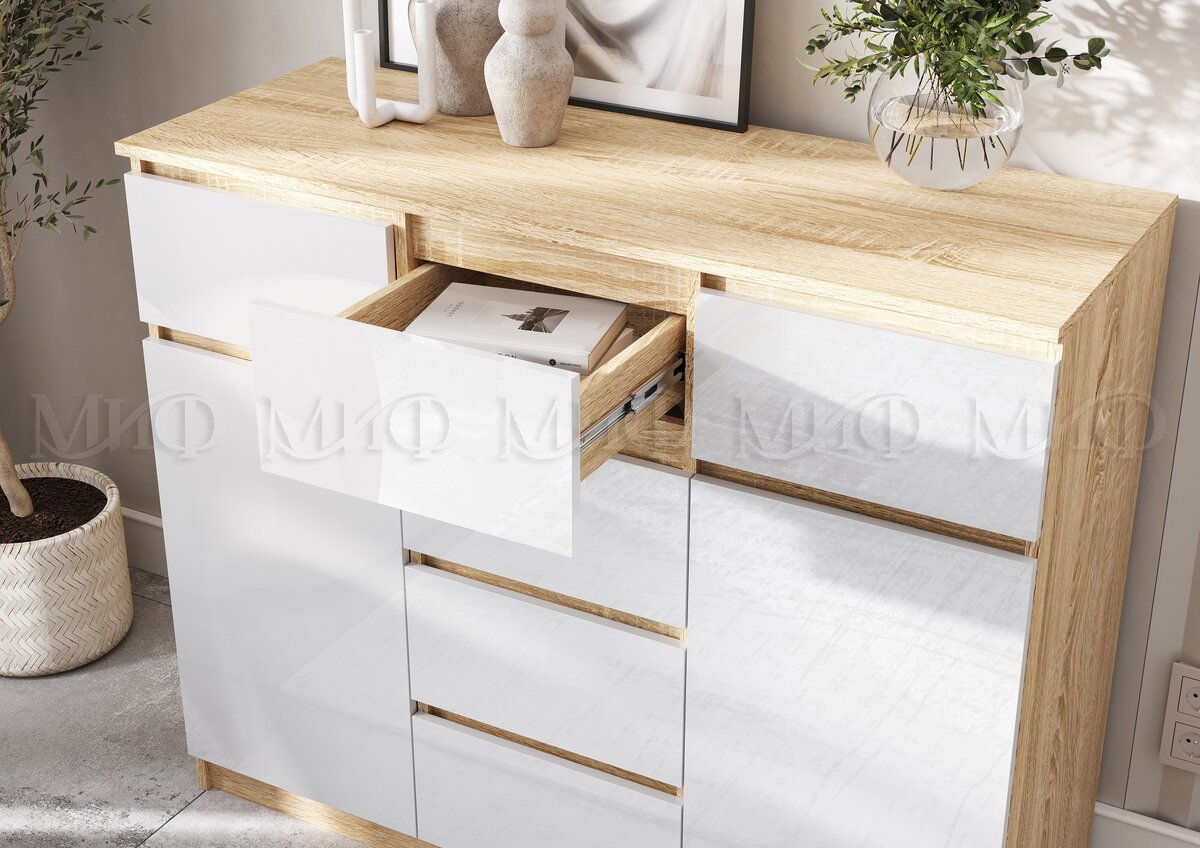 - Комод 1200 (2 двери 6 ящиков) Челси Белый Глянец, Дуб Сонома