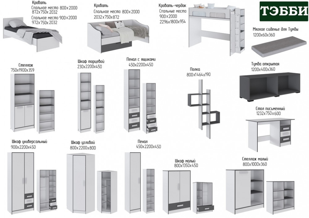 Цена за комплект: Пенал, Пенал с ящиками,Шкаф угловой, Стеллаж, Кровать-чердак, Кровать с ящиком, Кровать (сп/м 800*2000мм), Полка навесная