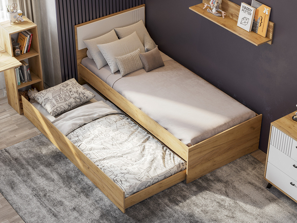 В комплект входит: Кровать одинарная + Основание под матрац 0,9*2,0м (ЛДСП) + Кровать выкатная