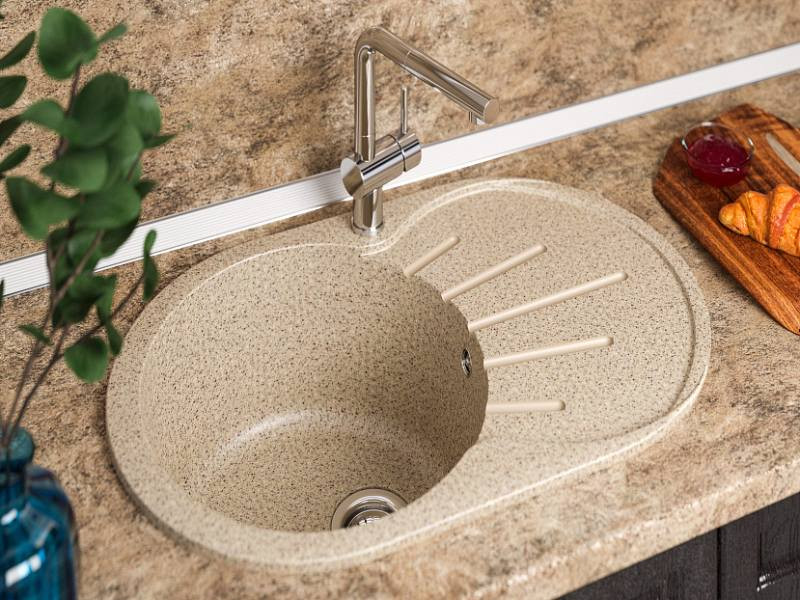 - Изготовленная из прочного искусственного кварцевого камня, мойка отличается долговечностью и надежностью. Этот материал устойчив к различным видам повреждений и выдерживает высокие температуры.