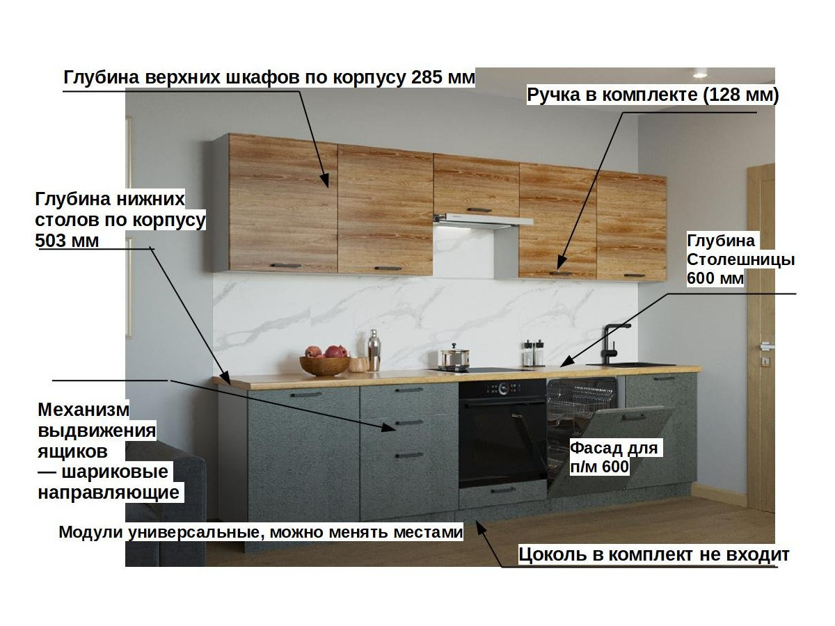 Кухонная мойка, стеновая панель, посудосушитель, планки для столешницы в комплект не входят.