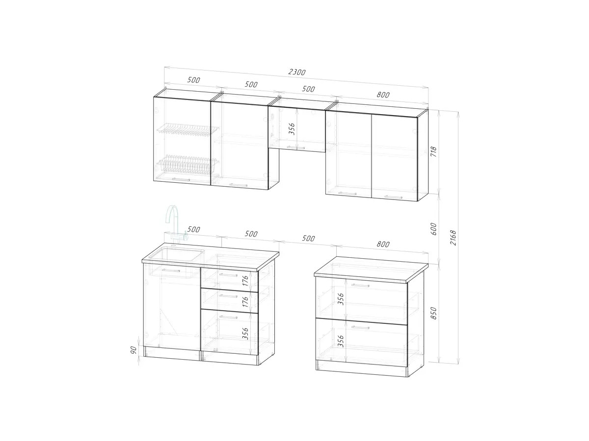 Мойка, смеситель, стеновая панель и посудосушитель в комплект гарнитура не входят.