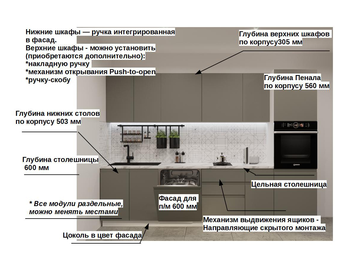 Кухонная мойка, стеновая панель, посудосушитель, планки для столешницы в комплект не входят.