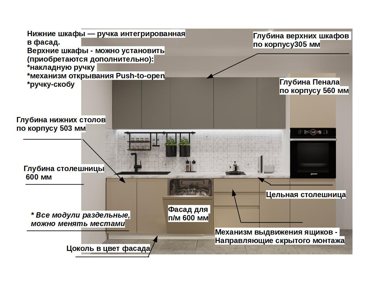 Кухонная мойка, стеновая панель, посудосушитель, планки для столешницы в комплект не входят.