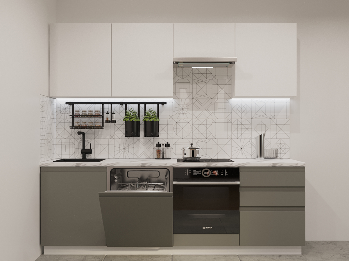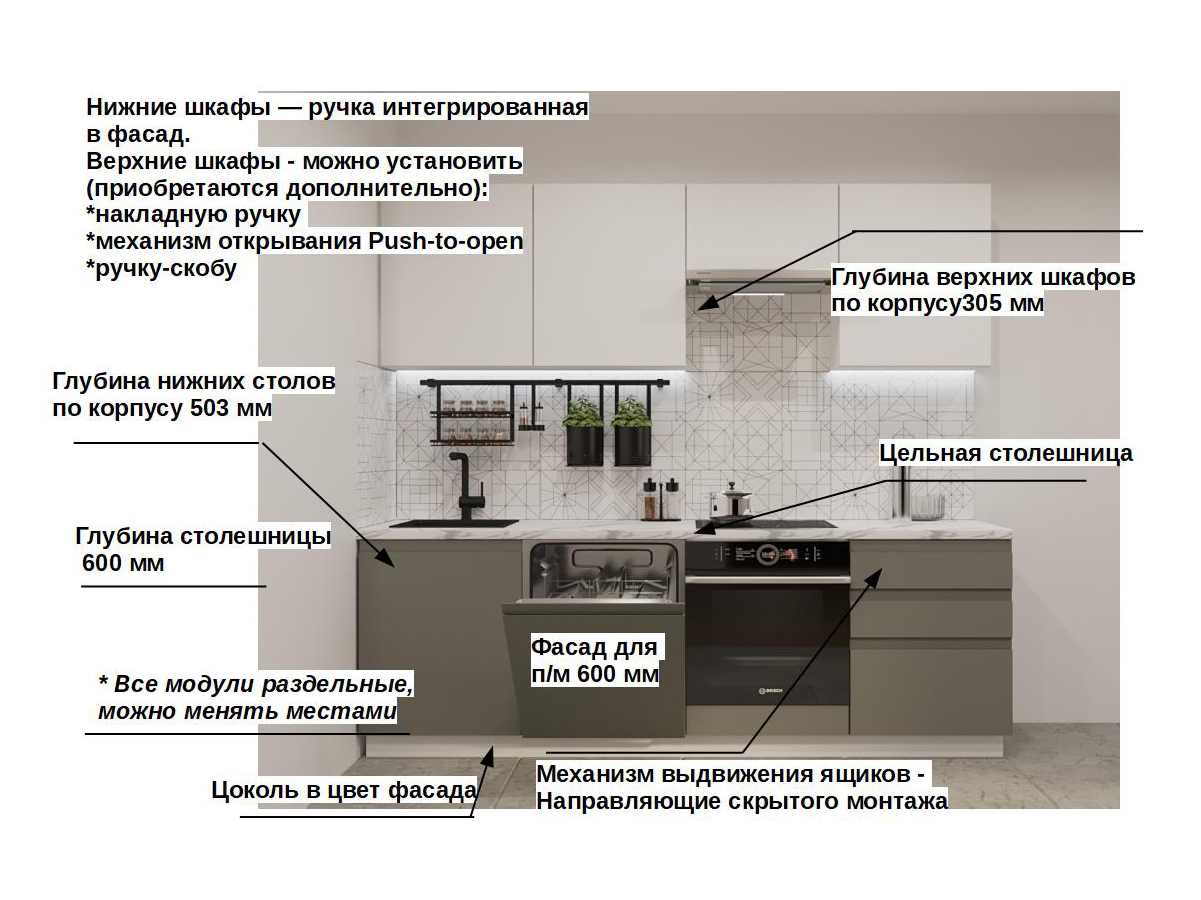 Кухонная мойка, стеновая панель, посудосушитель, планки для столешницы в комплект не входят.