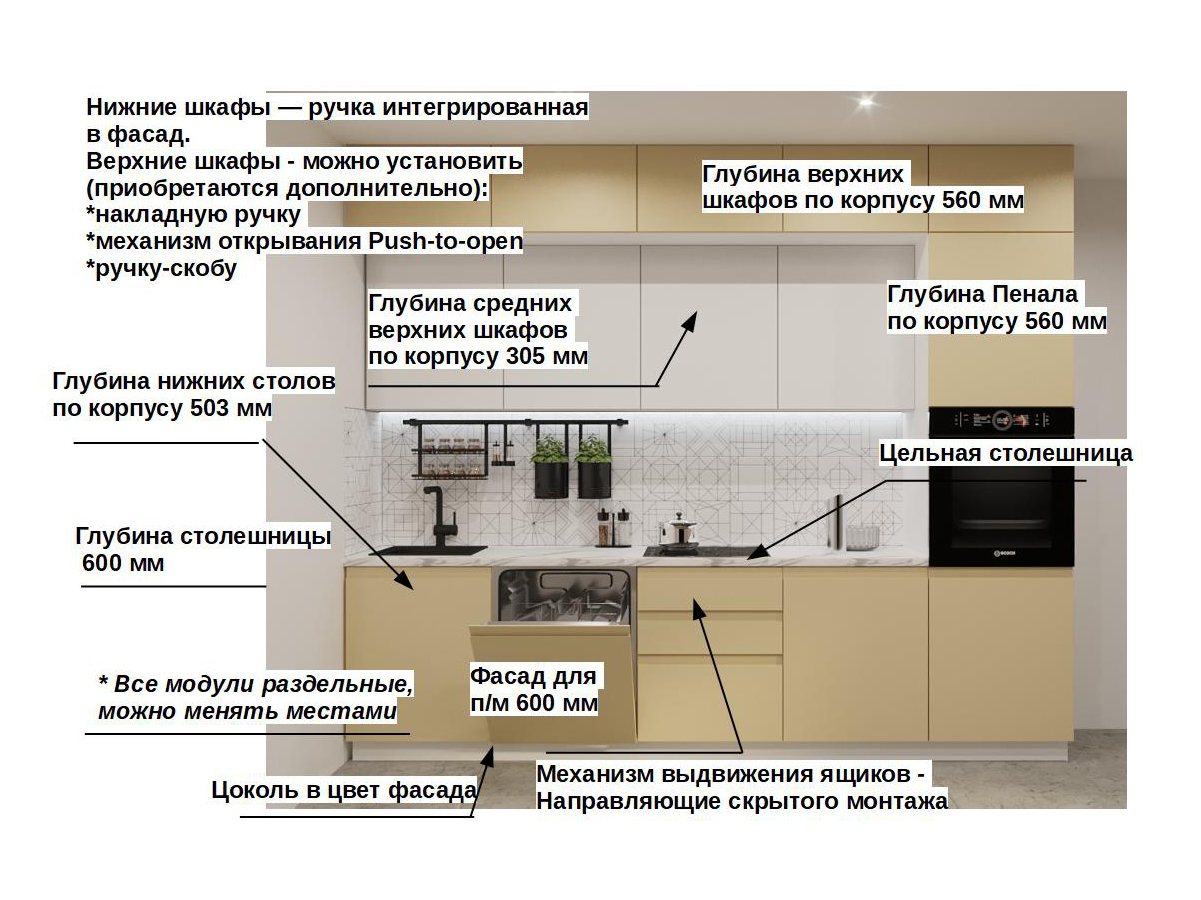 Кухонная мойка, стеновая панель, посудосушитель, планки для столешницы в комплект не входят.