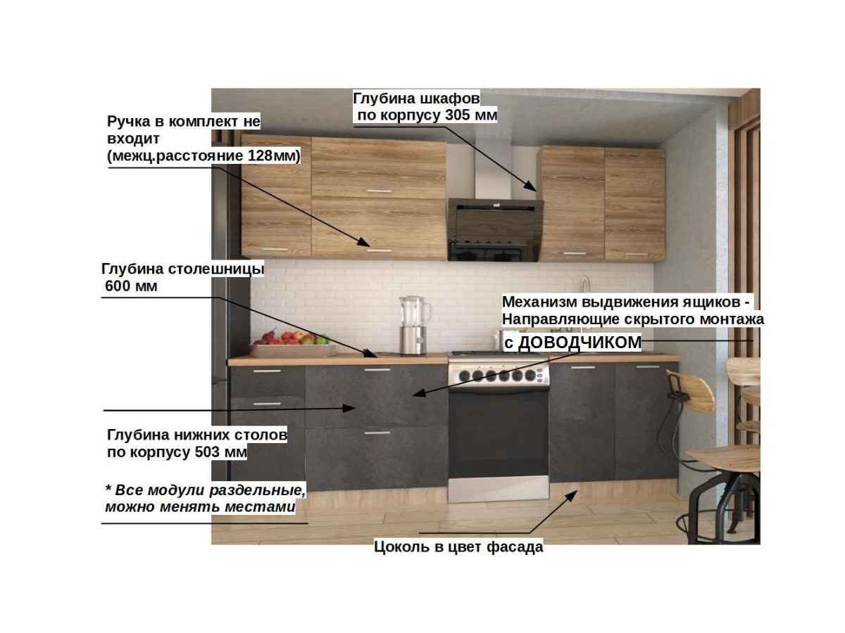 Кухонная мойка, стеновая панель, посудосушитель, планки для столешницы в комплект не входят.