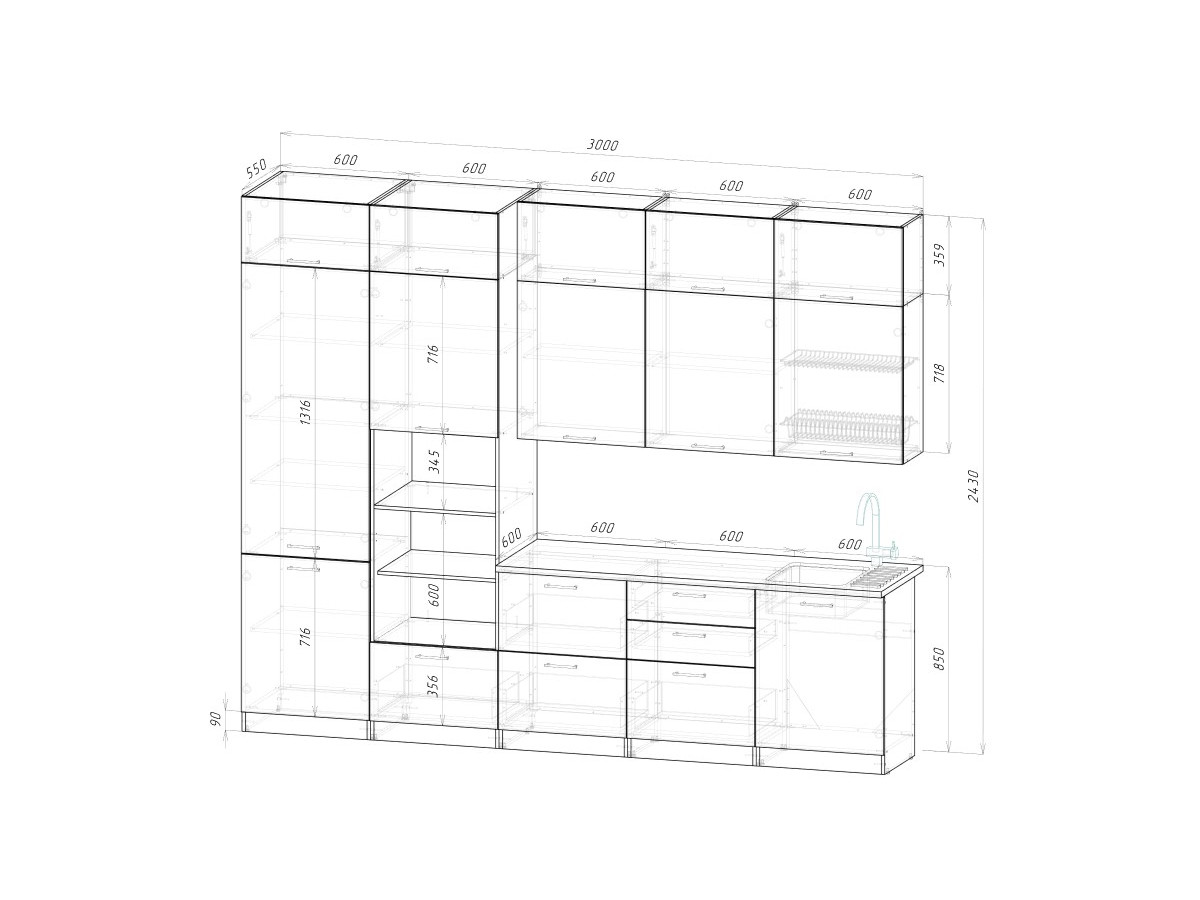 Мойка, смеситель, стеновая панель и посудосушитель в комплект гарнитура не входят.