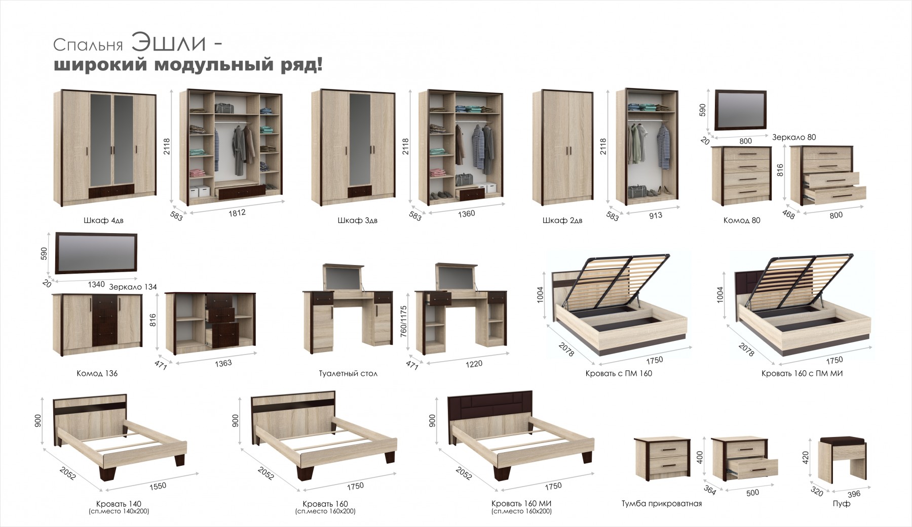 Спальня модульная, комплектуется по вашему выбору. Цена указана за комплект на главном фото - тумба прикроватная, шкаф 3 дверный, кровать 140, комод 80