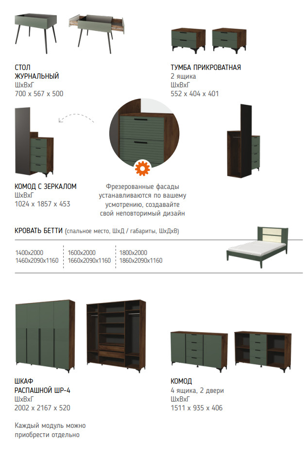 Цена за комплект: кровать Бетти 1400, Комплектующие на кровать с ламелями 1400 мм, шкаф ШР-4, комод с зеркалом, тумба прикроватная