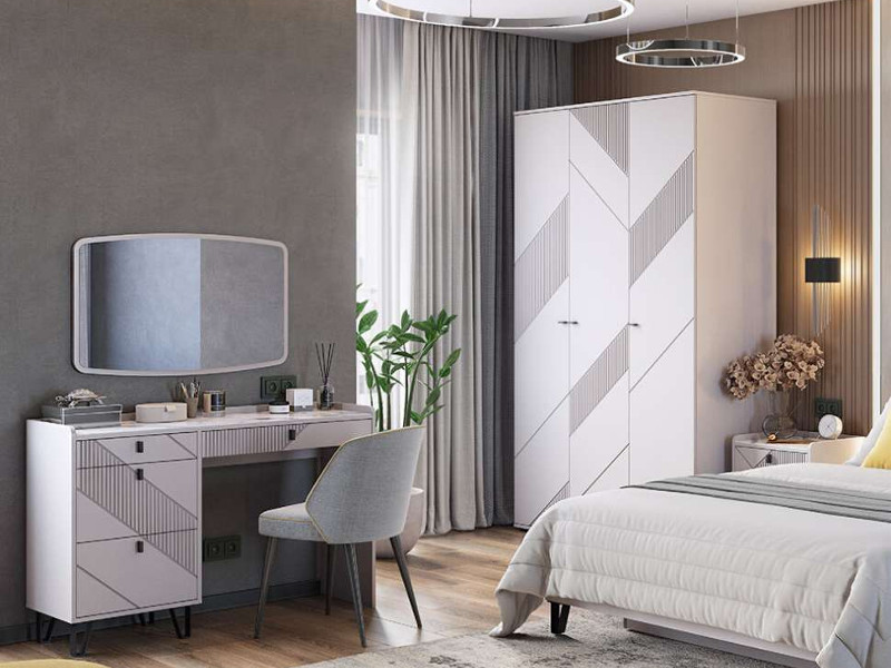 Цена за комплект: Зеркало, Туалетный столик, Тумба прикроватная (2шт), Шкаф 3х дверный, Кровать 1400 спинка МДФ, Основание для кровати ЛАЙТ 1400
