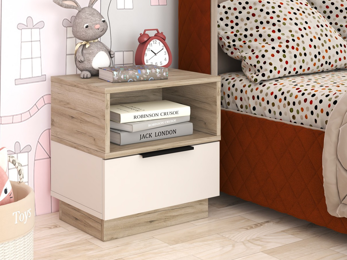 Средняя часть БОХО Тумба прикроватная – тумба с ящиком (Д.426 х В.176 х Г.330 мм). Ящик, с полезным объемом Д.336 х В.106 х Г.284 мм, крепится на шариковых направляющих полного выдвижения, длиной 300мм. Нагрузка на комплект направляющих – 10 кг с учетом веса ящика. Задняя стенка – ЛХДФ.