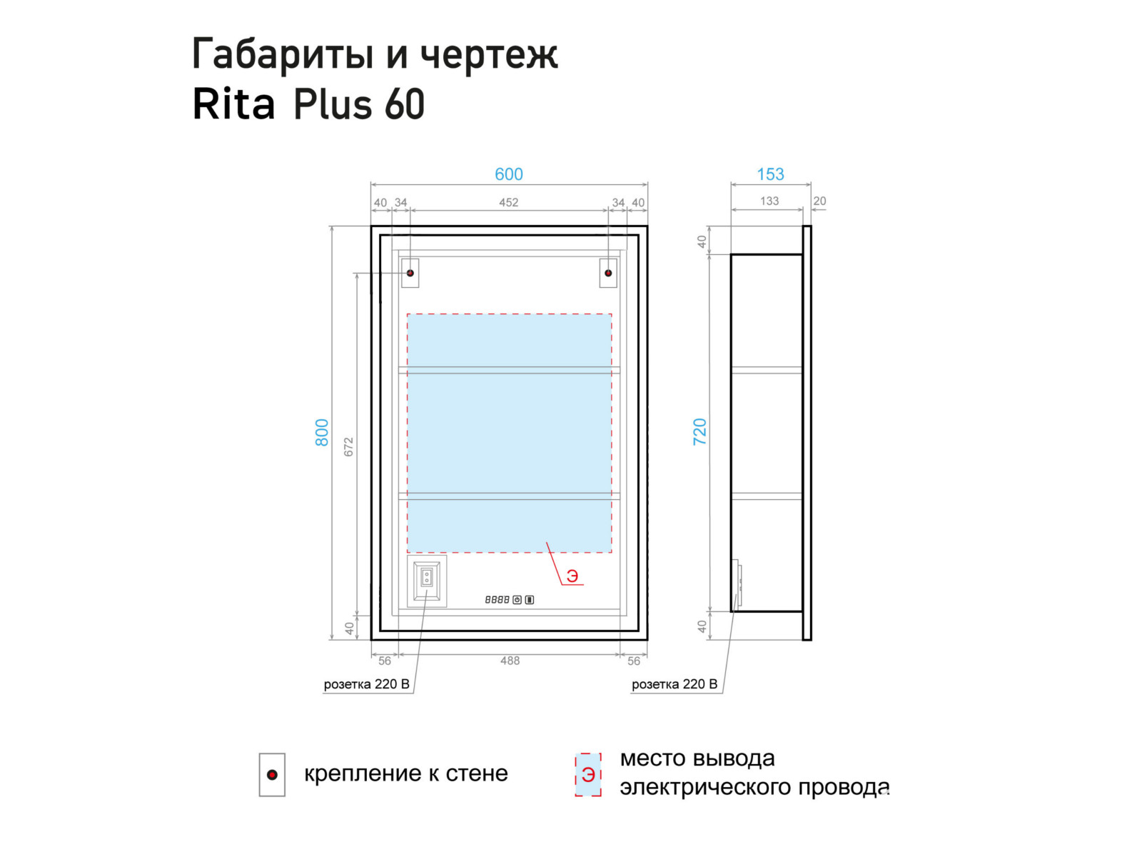 - Шкаф зеркальный Rita 60 с подсветкой и часами