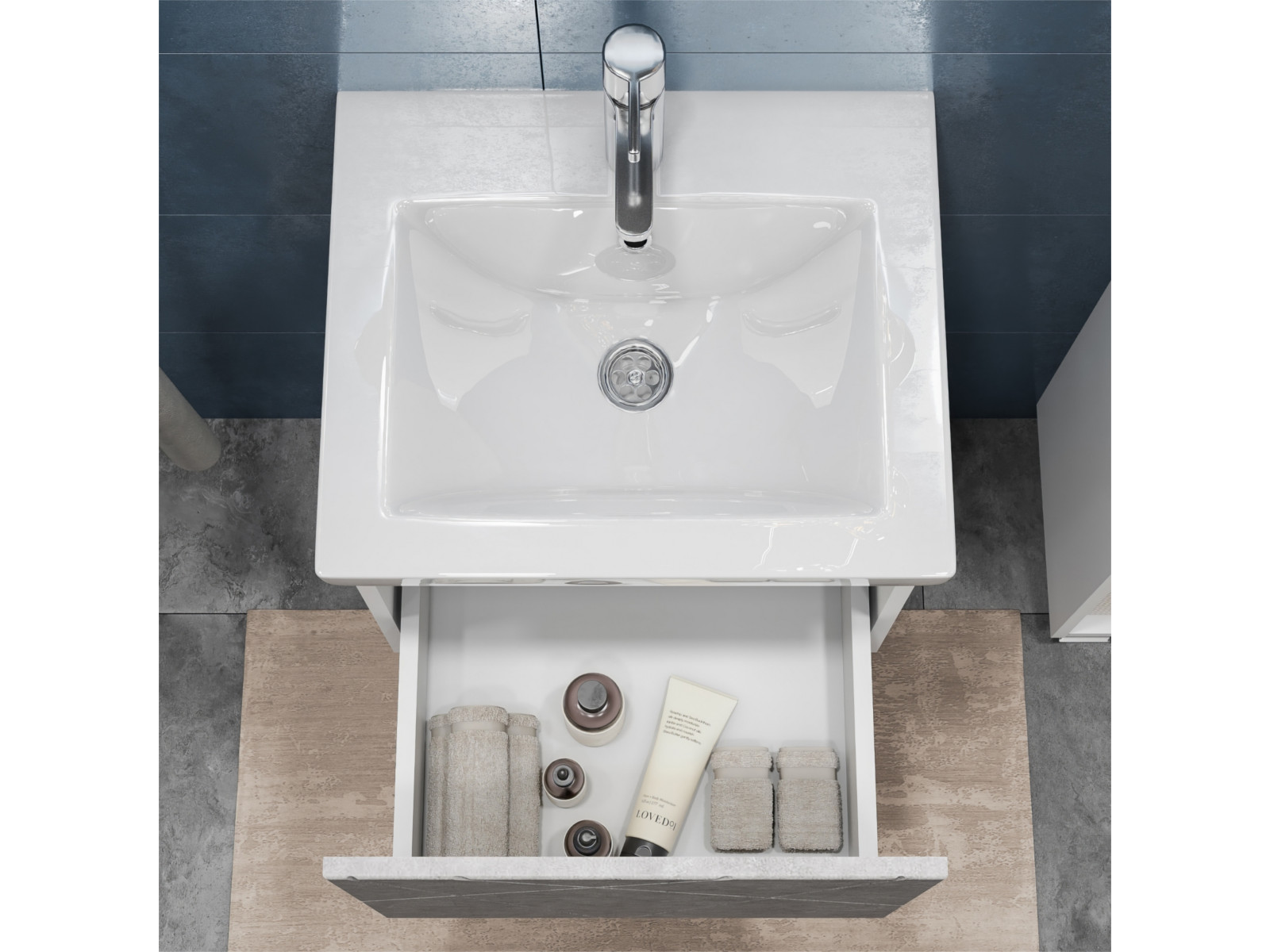 Оснащение: 1 выдвижной ящик, направляющие скрытого монтажа, открывание нажатием "push-to-open", 2 навеса, 1 сифон