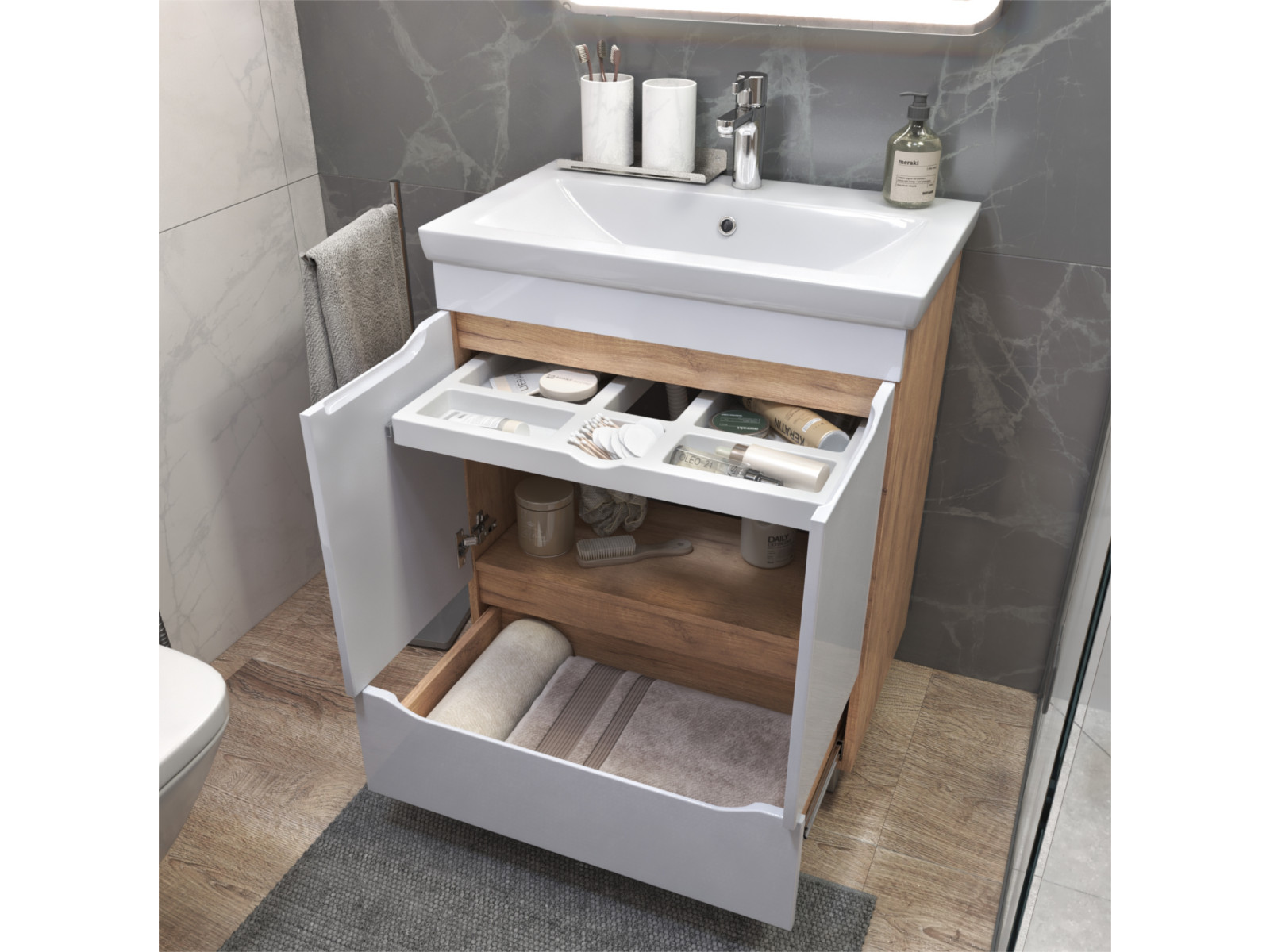 Оснащение: 2 дверцы, петли с механизмом доводчика, 1 ящик, выдвижной органайзер для мелочей, шариковые направляющие полного выдвижения, 2 опоры квадратные регулируемые; 2 кухонные опоры