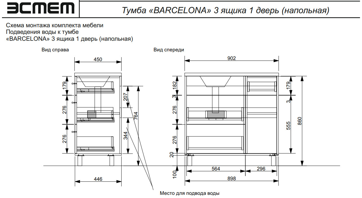 - Тумба с раковиной Barcelona 900 левосторонний напольный 3 ящика 1 дверь