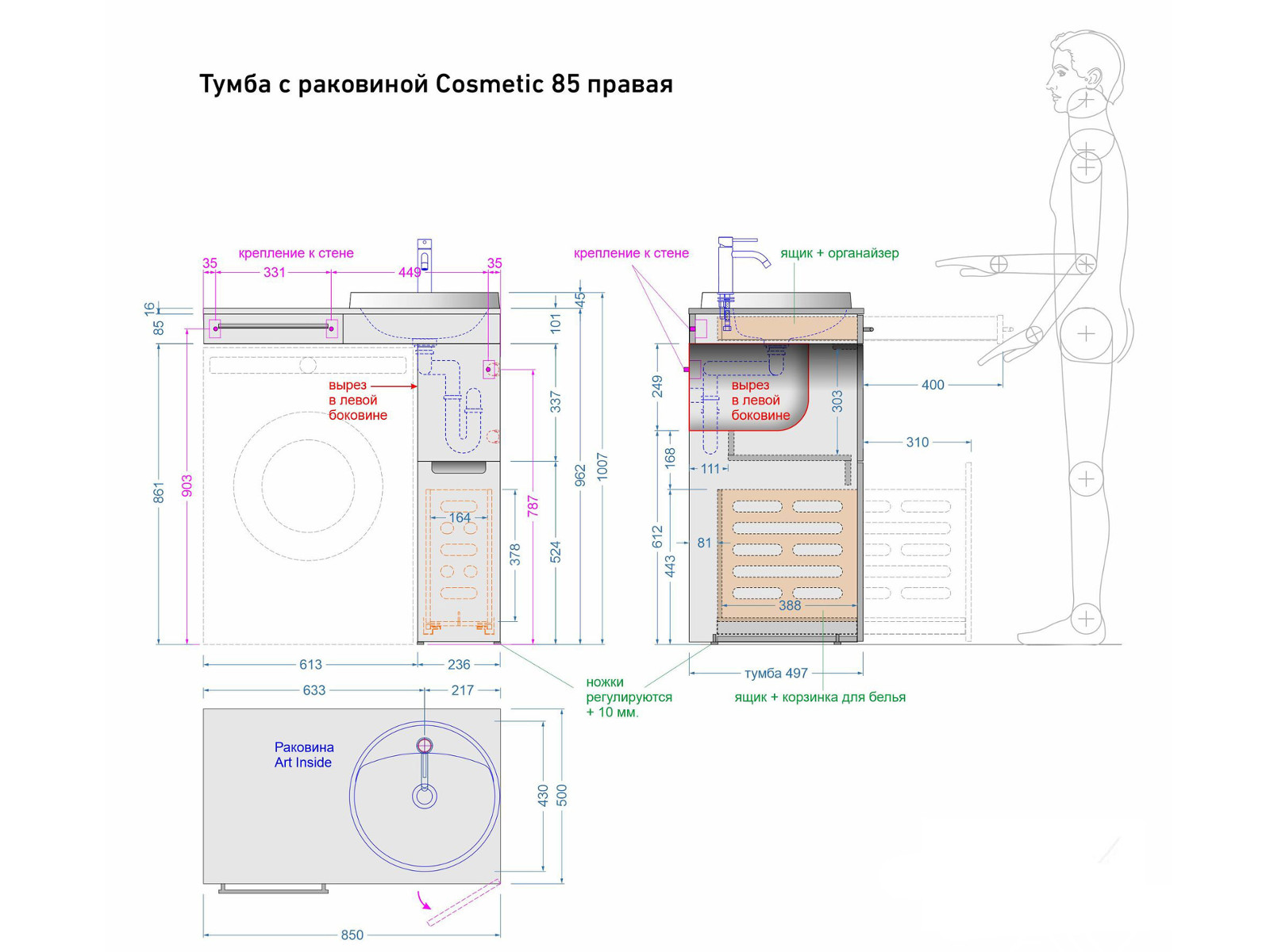 Тумба с раковиной Cosmetic 85 белая правая