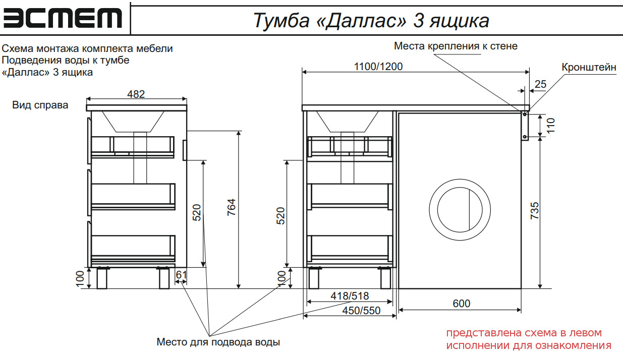 Тумба с раковиной Dallas Luxe 1150 напольная 3 ящика правая