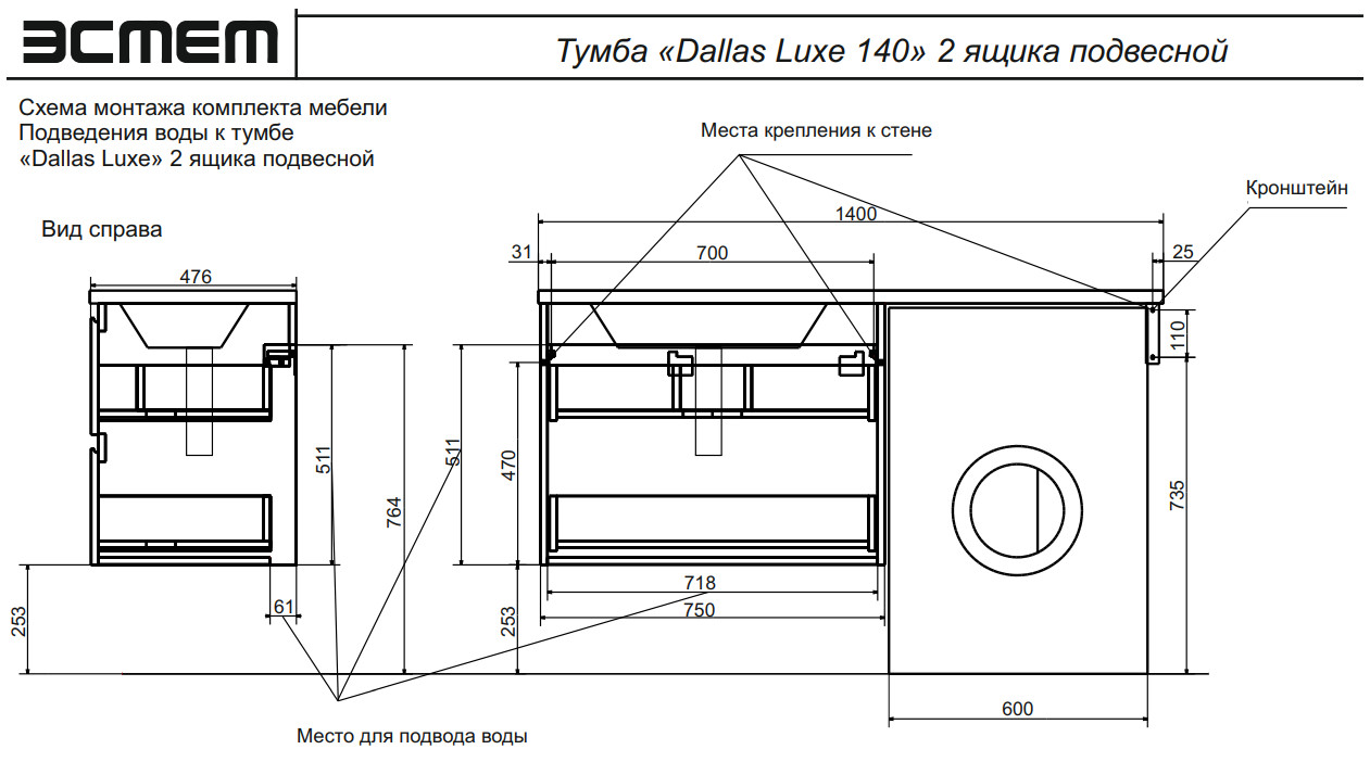Тумба с раковиной Dallas Luxe 1400 навесная 2 ящика левая