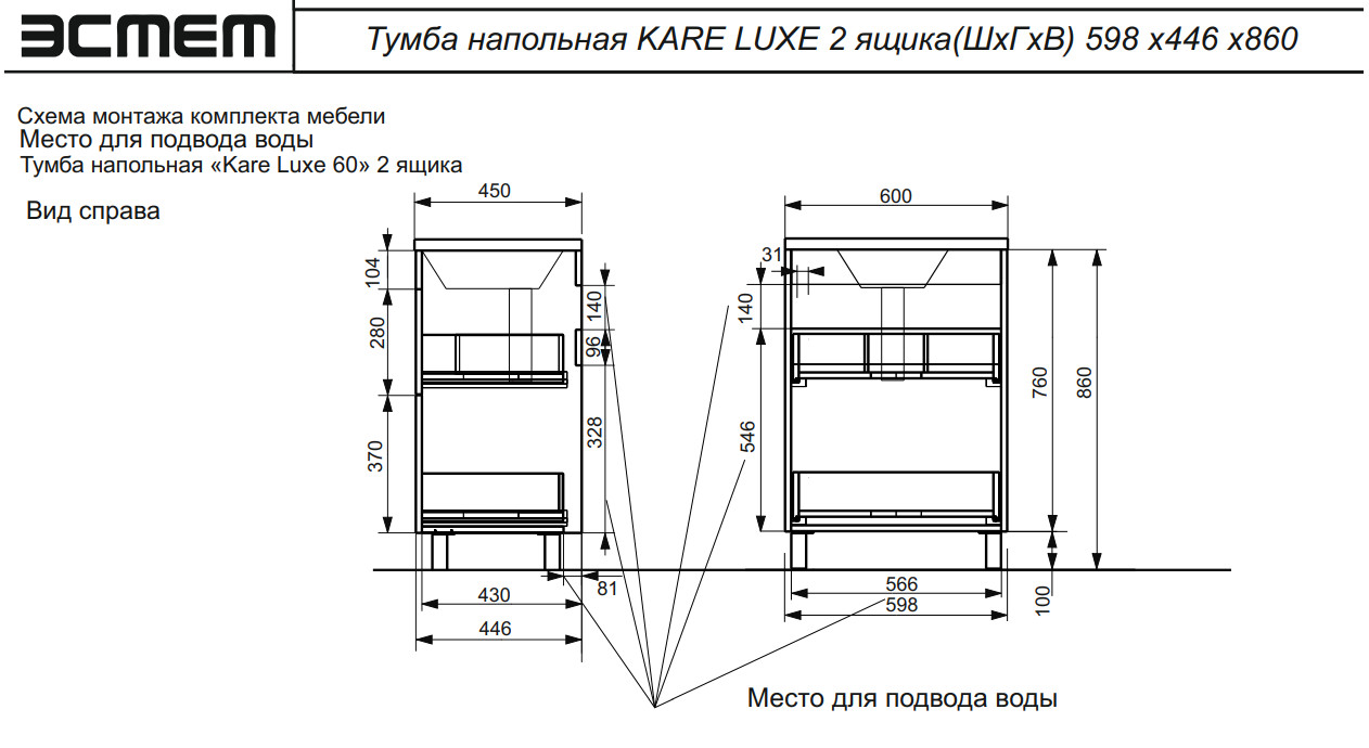 - Тумба с раковиной Kare Luxe 600 напольная 2 ящика
