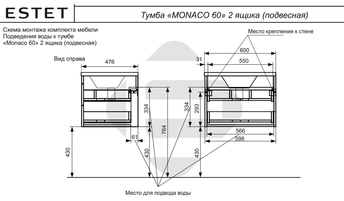 - Тумба с раковиной Monaсo 600 навесная 2 ящика