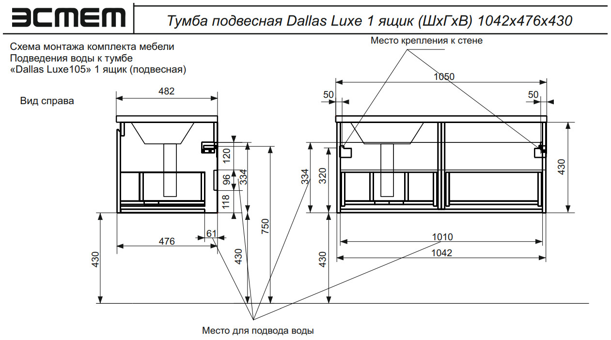 Тумба с раковиной слева Dallas Luxe 1050 навесная 1 длинный ящик