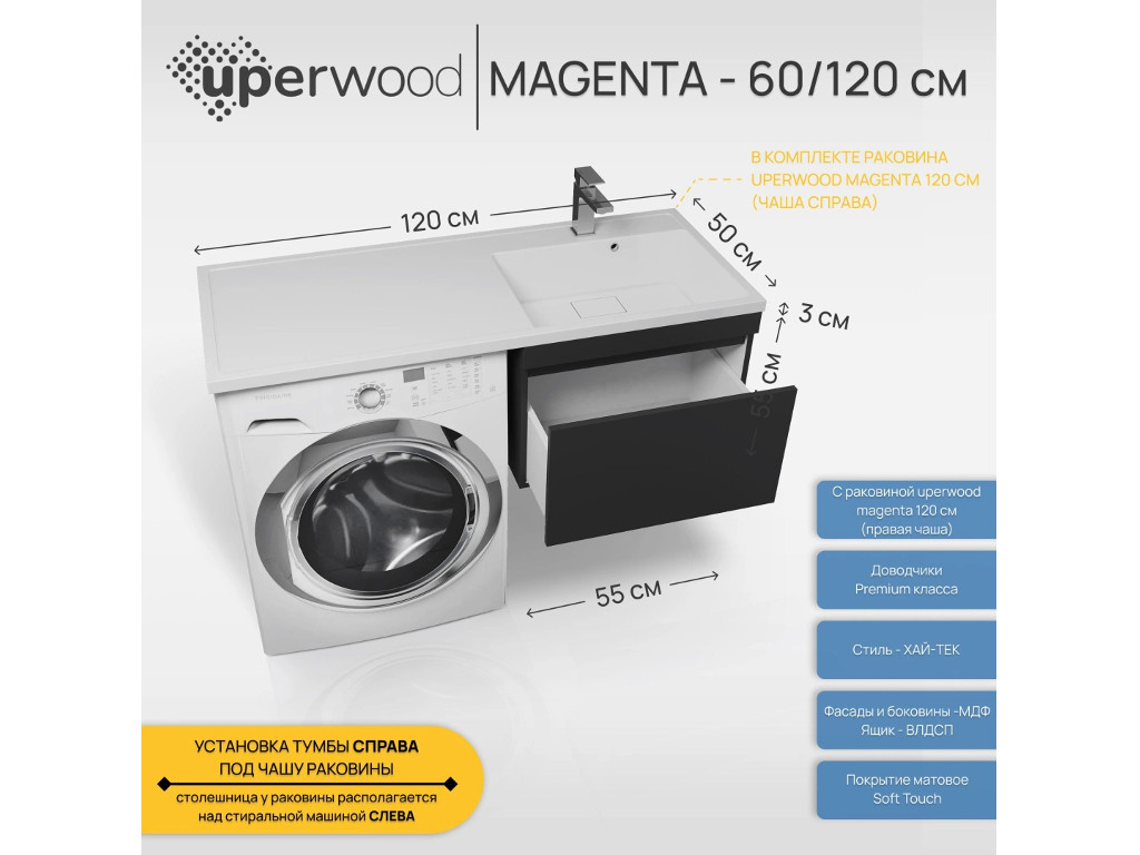 Тумба с раковиной Uperwood Magenta 60-120 см подвесная черная выдвижной ящик правая