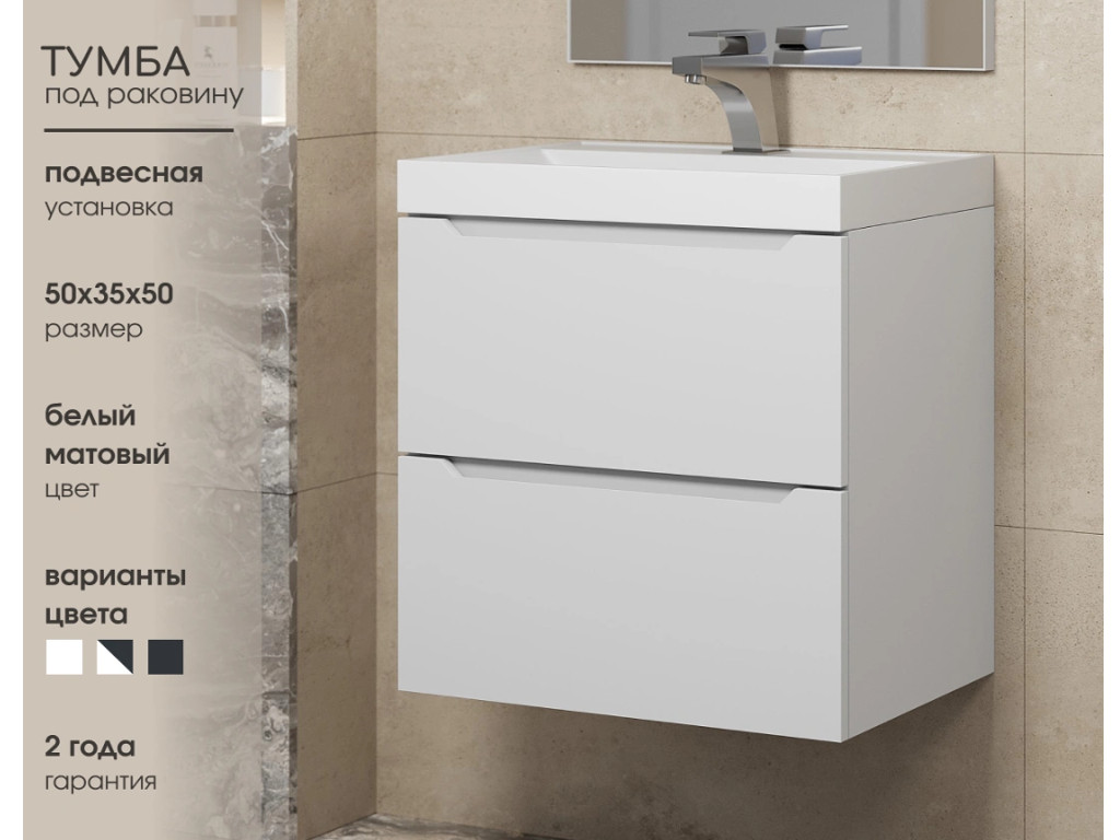 - Тумба с раковиной Uperwood Tanos матовая белая 50 см