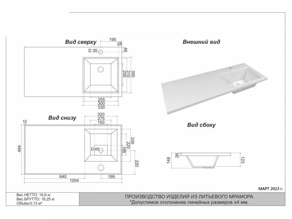 Размеры раковины: