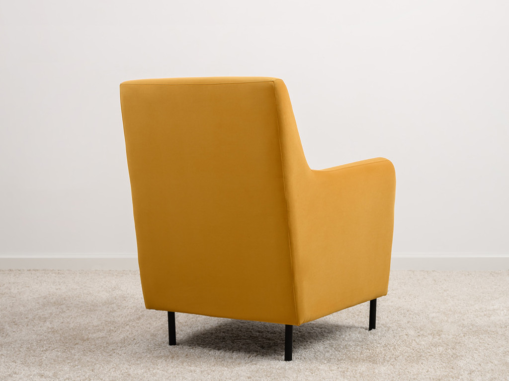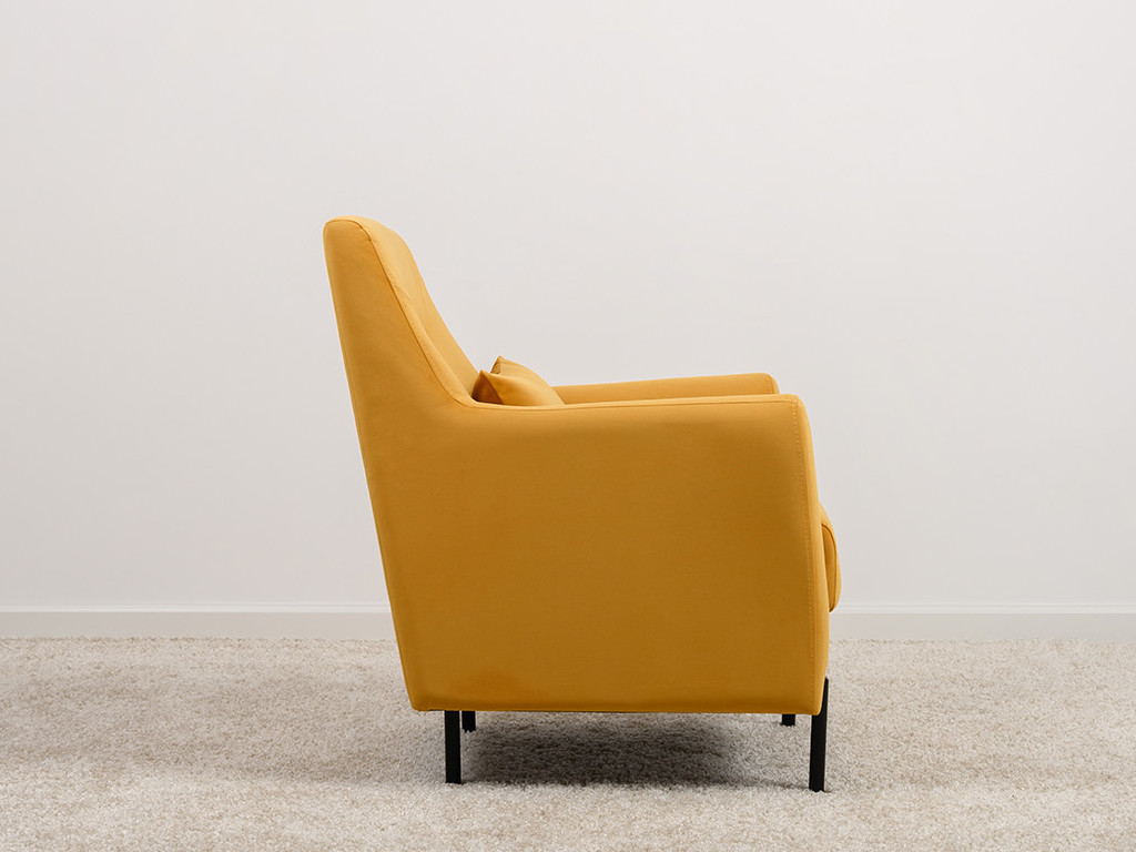 Декоративная утяжка на спинке кресла, декоративная подушка в цвете кресла, металлические опоры переходят в декоративный элемент подлокотника
