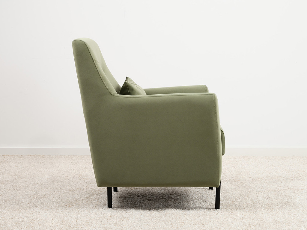 Декоративная утяжка на спинке кресла, декоративная подушка в цвете кресла, металлические опоры переходят в декоративный элемент подлокотника