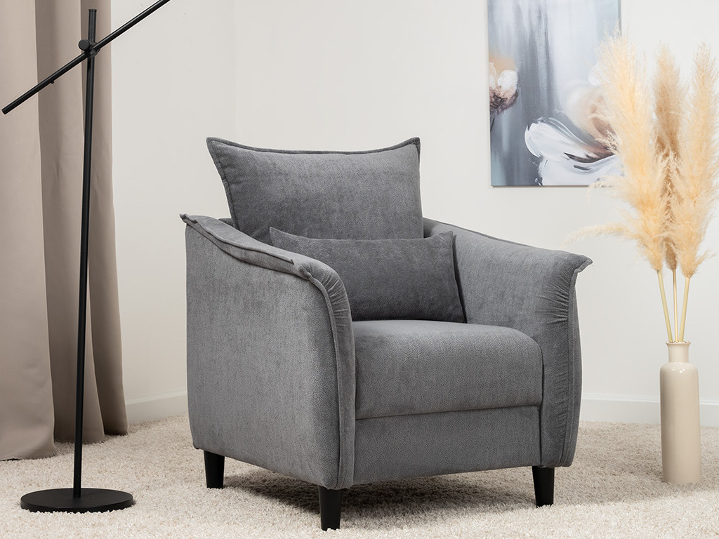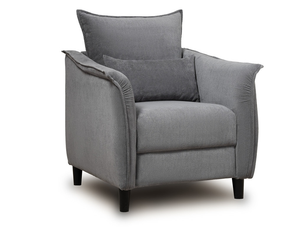 Кресло с приспинной подушкой трапецивидной формы на молнии, по трем сторонам которой проложена отделочная строчка на 1,2 см. По контуру боковин проложен декоративный кант на 1,2 см основной ткани. Кант проходит по центру передней части боковины, а по внутренней верхней части сборка.
