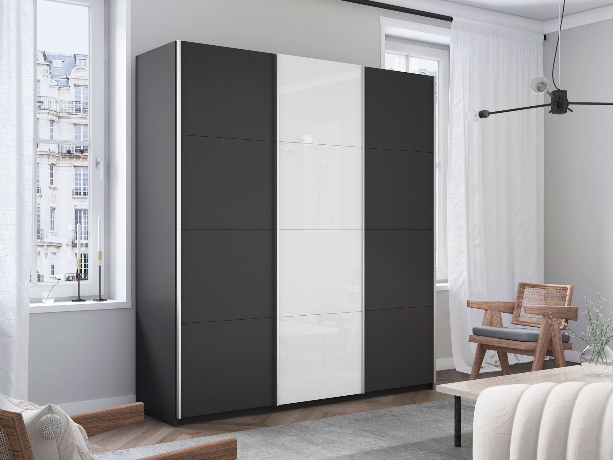 Шкаф-купе Прайм 3-х дверный 2100 ДСП/Стекло Белое/ДСП Серый Диамант