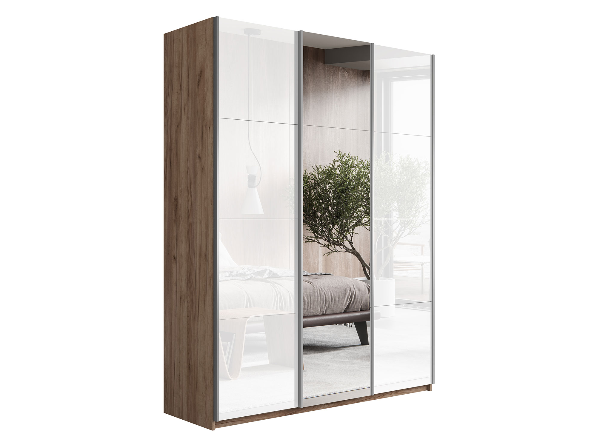 - Шкаф-купе Прайм 3-х дверный 2100 два Стекла Белые/Зеркало Крафт табачный