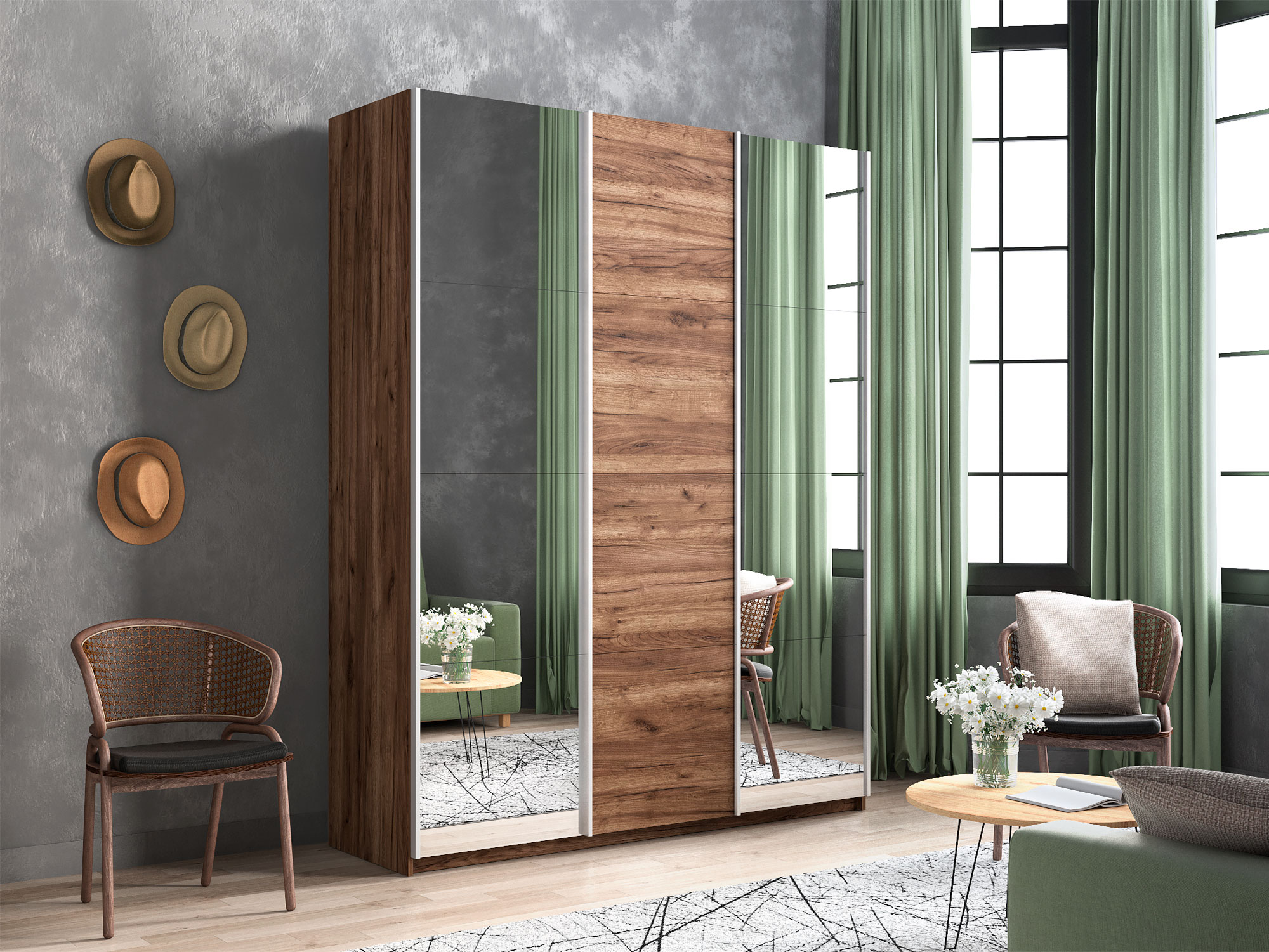 Шкаф-купе Прайм Широкий 3-х дверный два зеркала/ДСП Крафт табачный