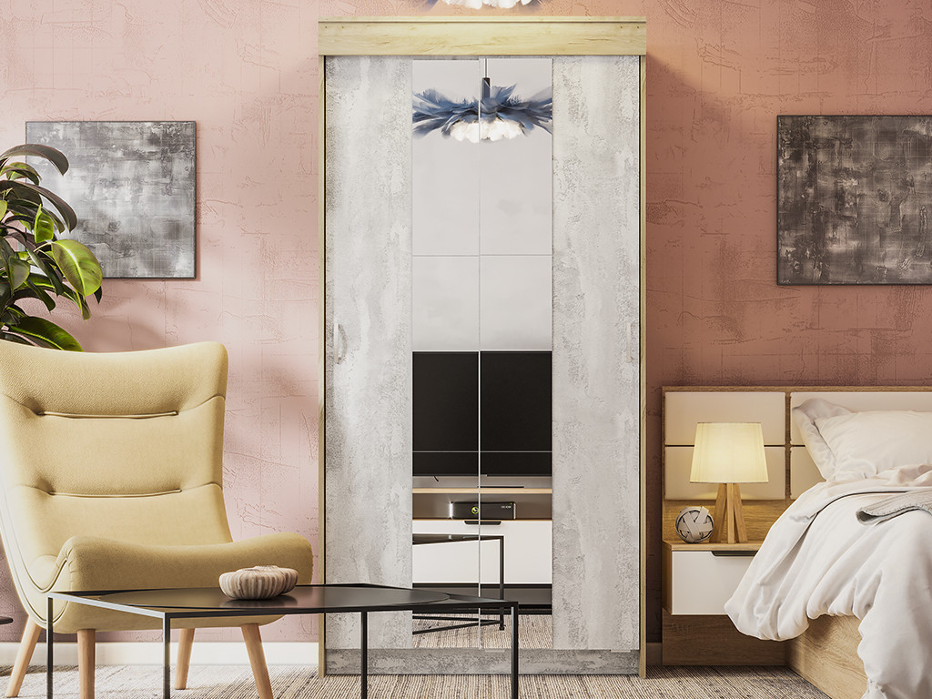 - Шкаф-купе Бассо дуб крафт серый/бетон каменный 2 зеркальные вставки
